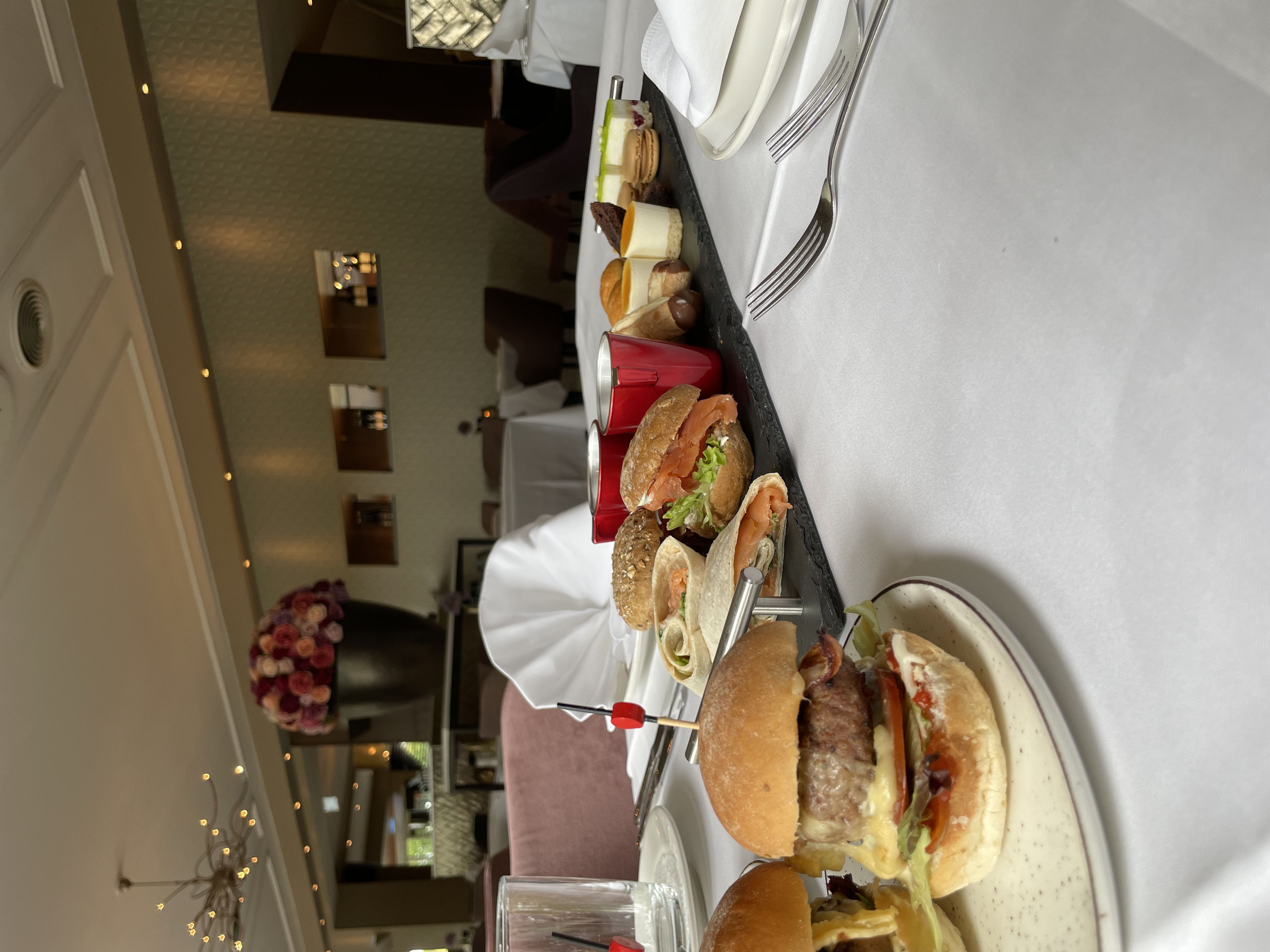 Mosterdsoepje,scone met jam en geslagen room, bavarois taartjes, muffin, luxe banketbakkers bonbon, New York cheesecake, boterkoek, bokkenpootje, macaron, bossche bol, brownie, wrapje met carpaccio, broodje met gerookte zalm, mini hamburgertje met sla, tomaat en zigeunersaus.