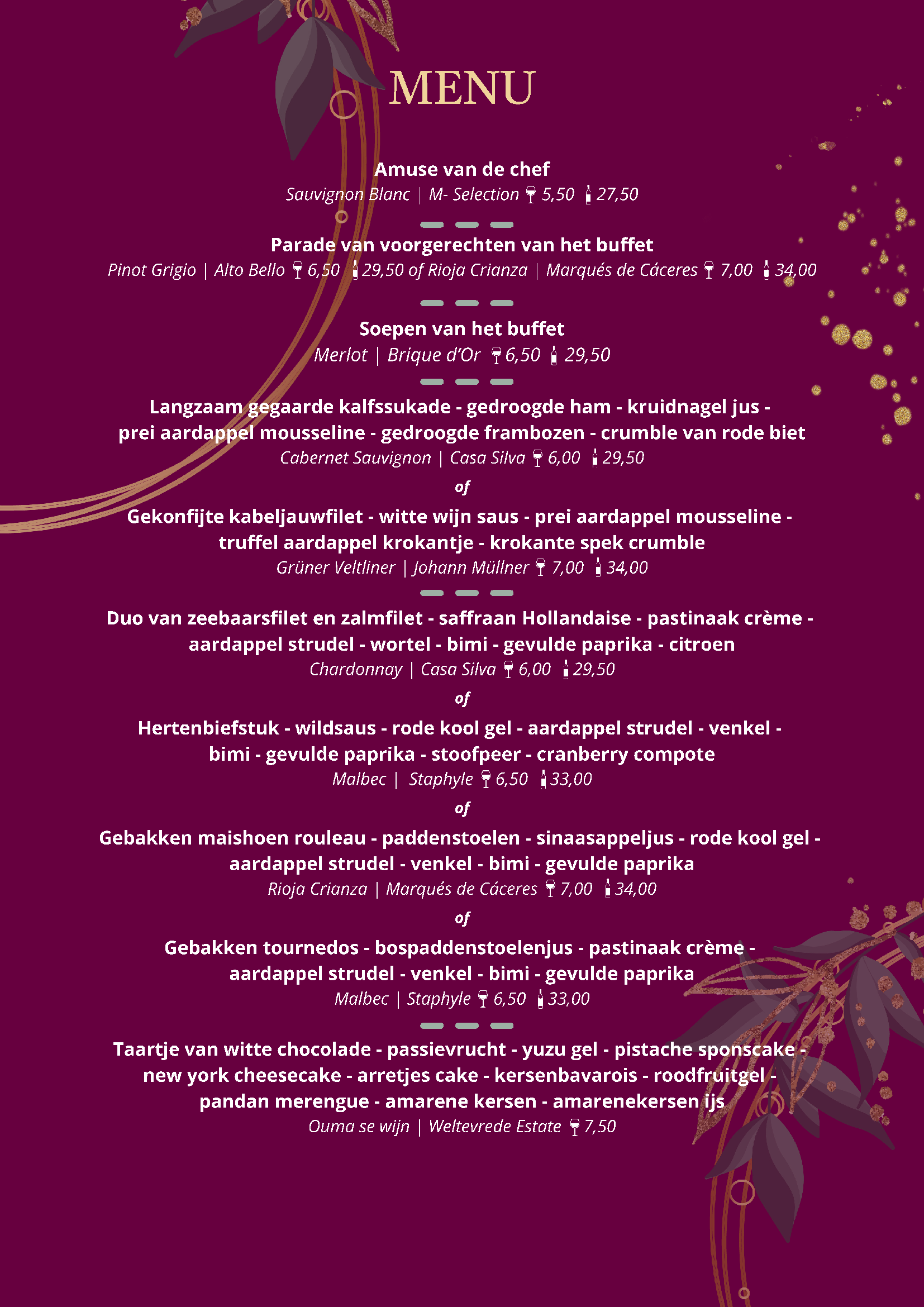 U wordt ontvangen met een smakelijke amuse, waarna u zelf de voorgerechten en soepen van het buffet kunt kiezen. Vervolgens serveren wij het tussengerecht, hoofdgerecht en een heerlijk dessert aan tafel!